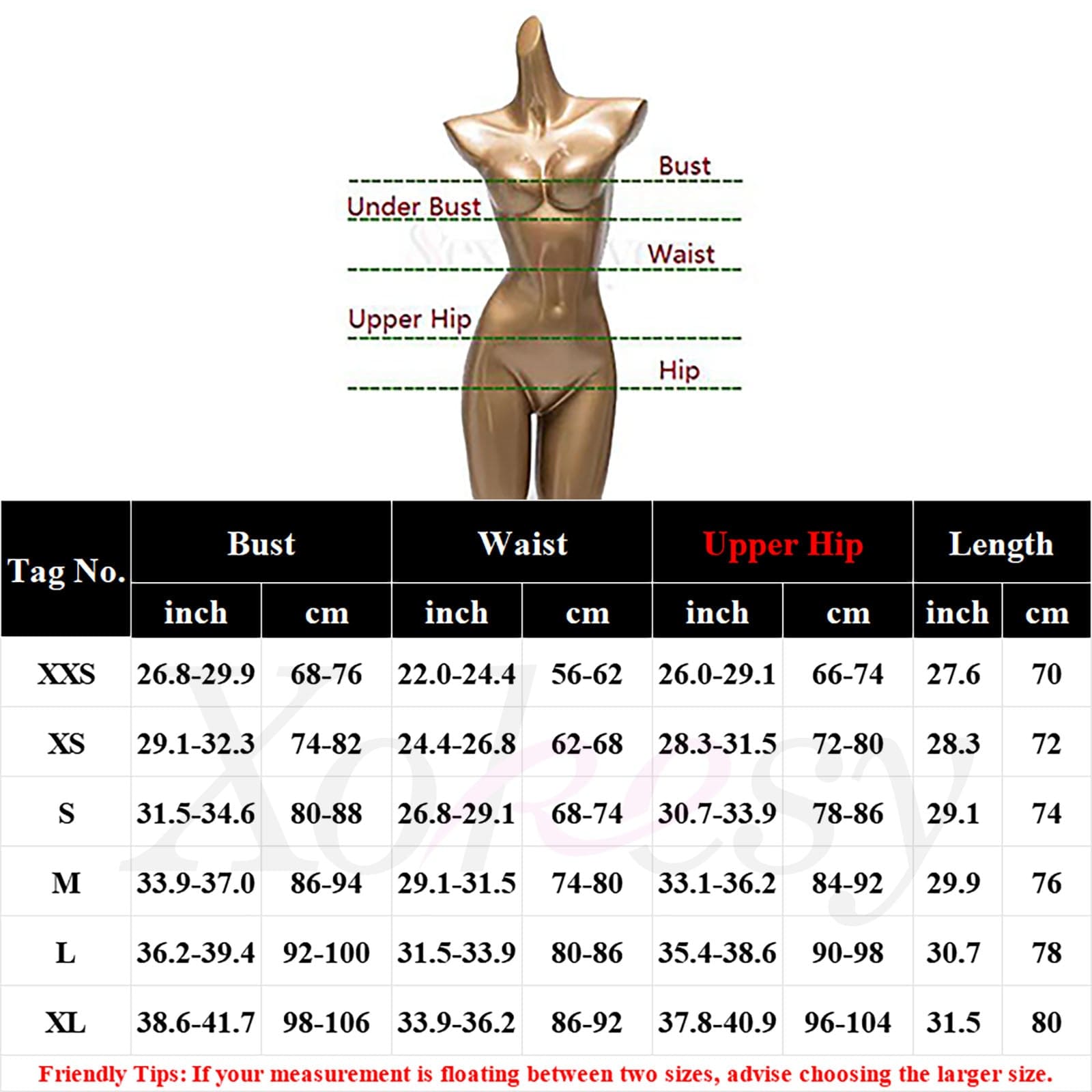 Size chart: XXS,XS,S,M,L,XL