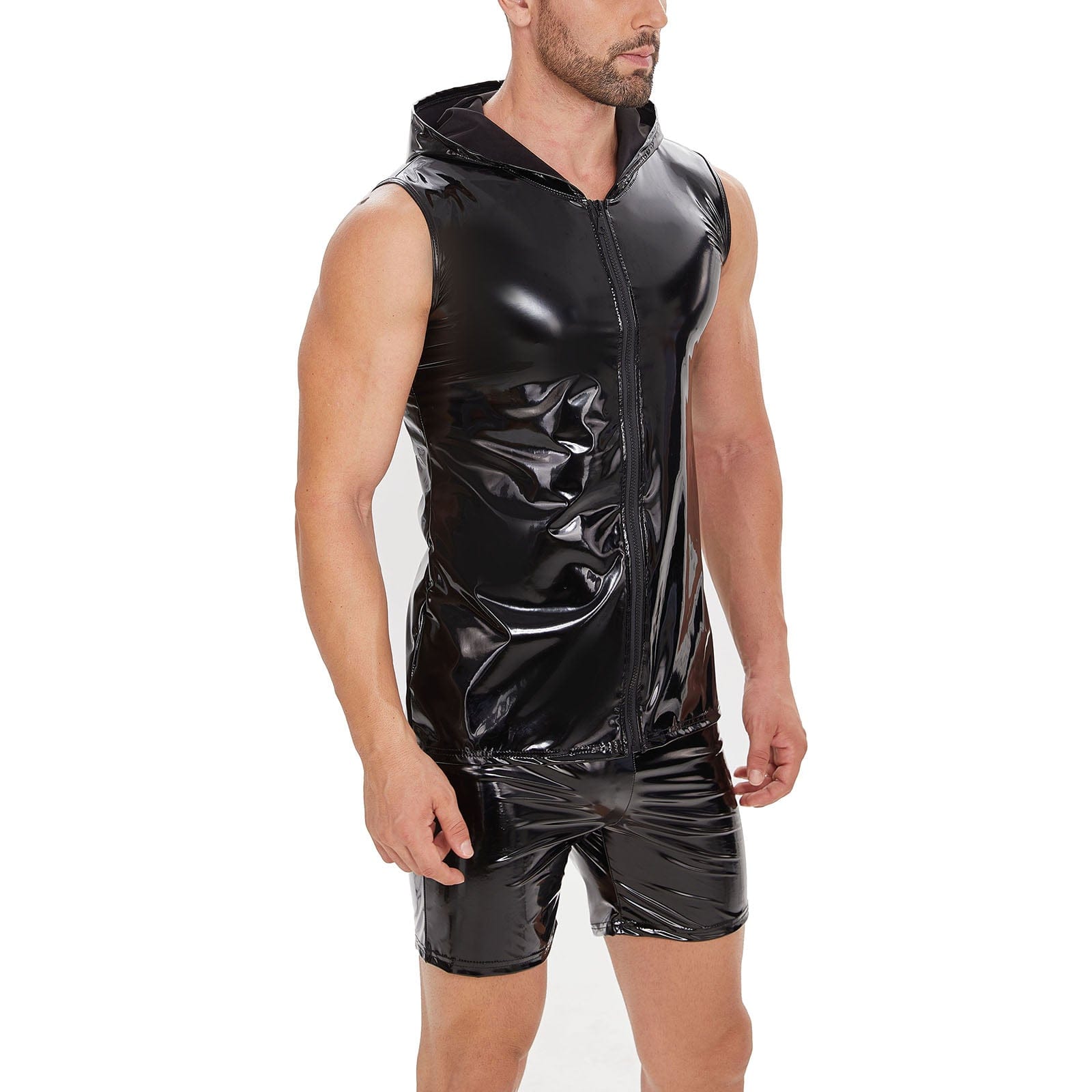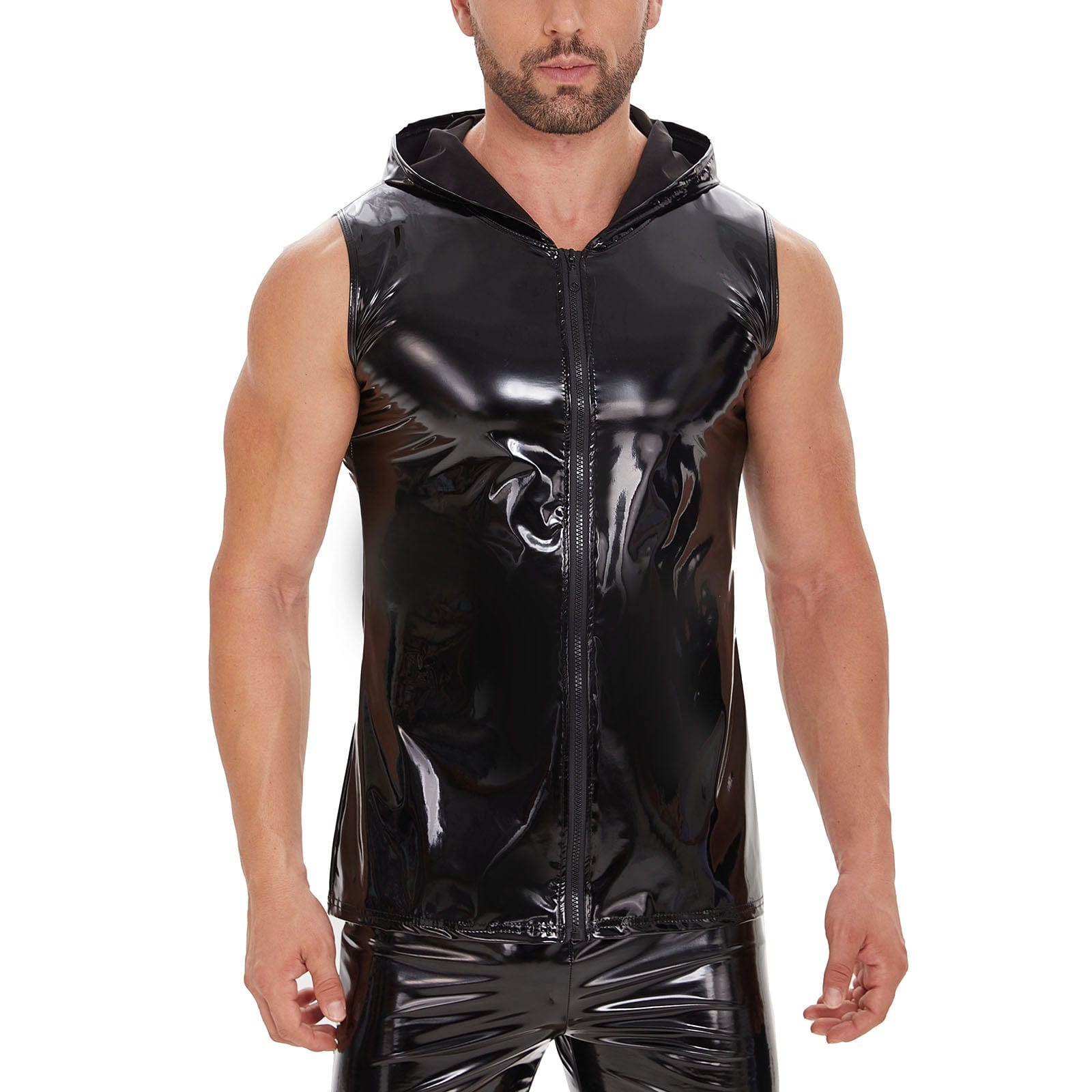 Men Shiny Leather PU Hoodies Jacket Sleeveless Casual Tank Tops Xokesy-259
