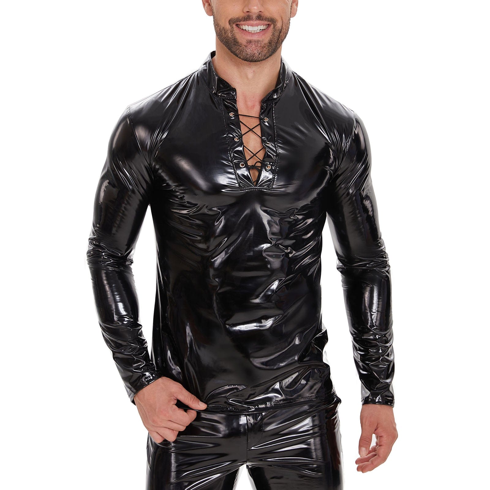 1. Mens shiny leather T-shirt, very erotic to wear.