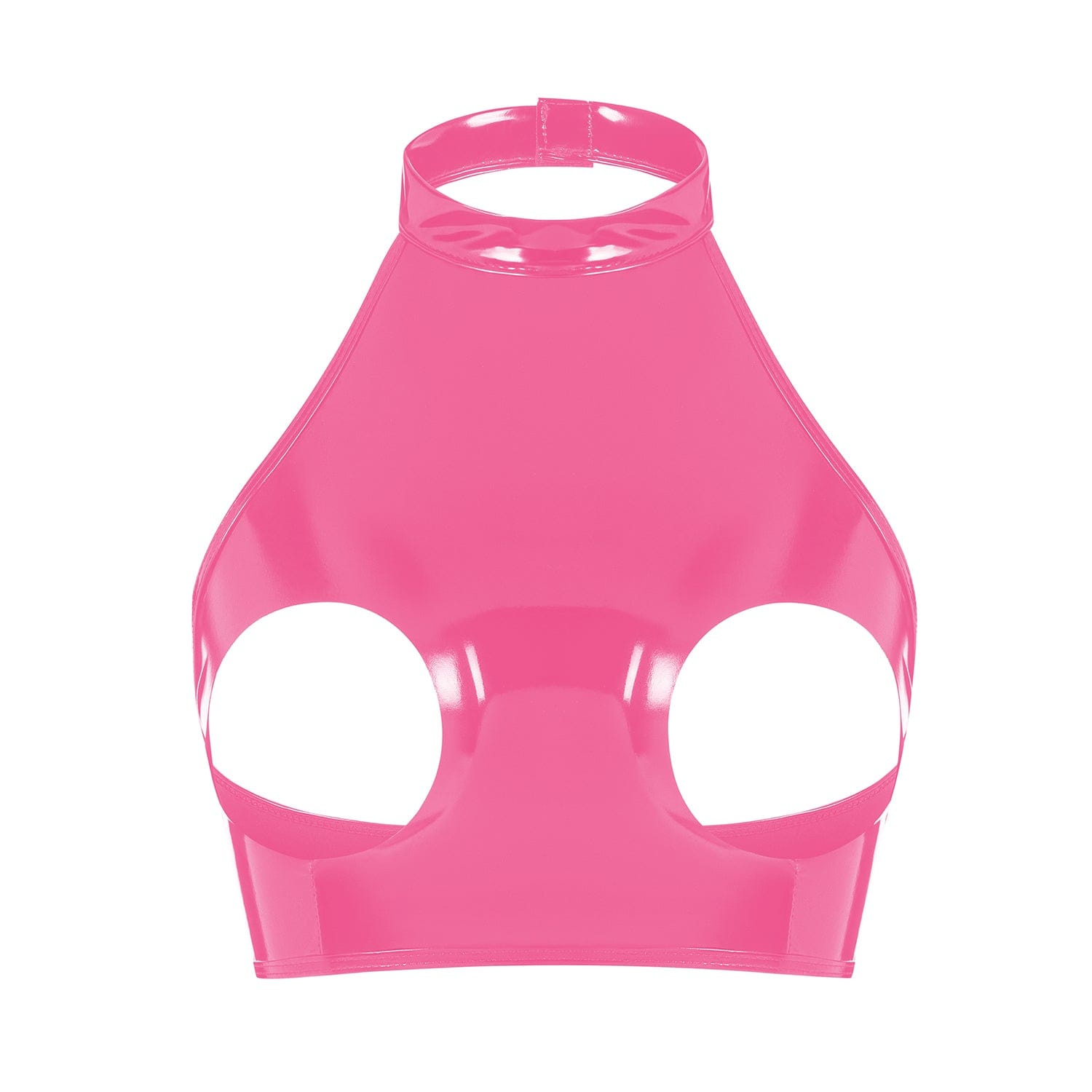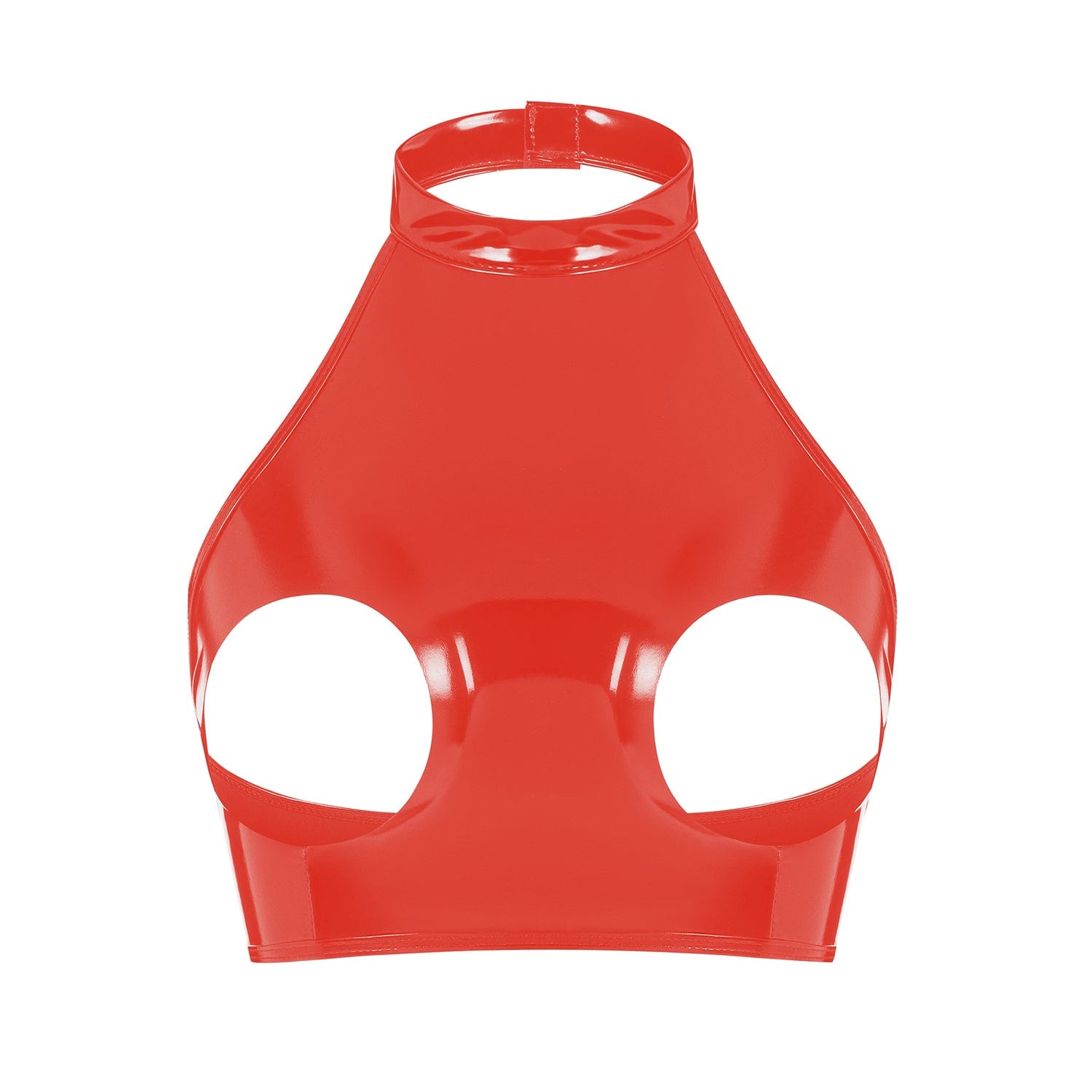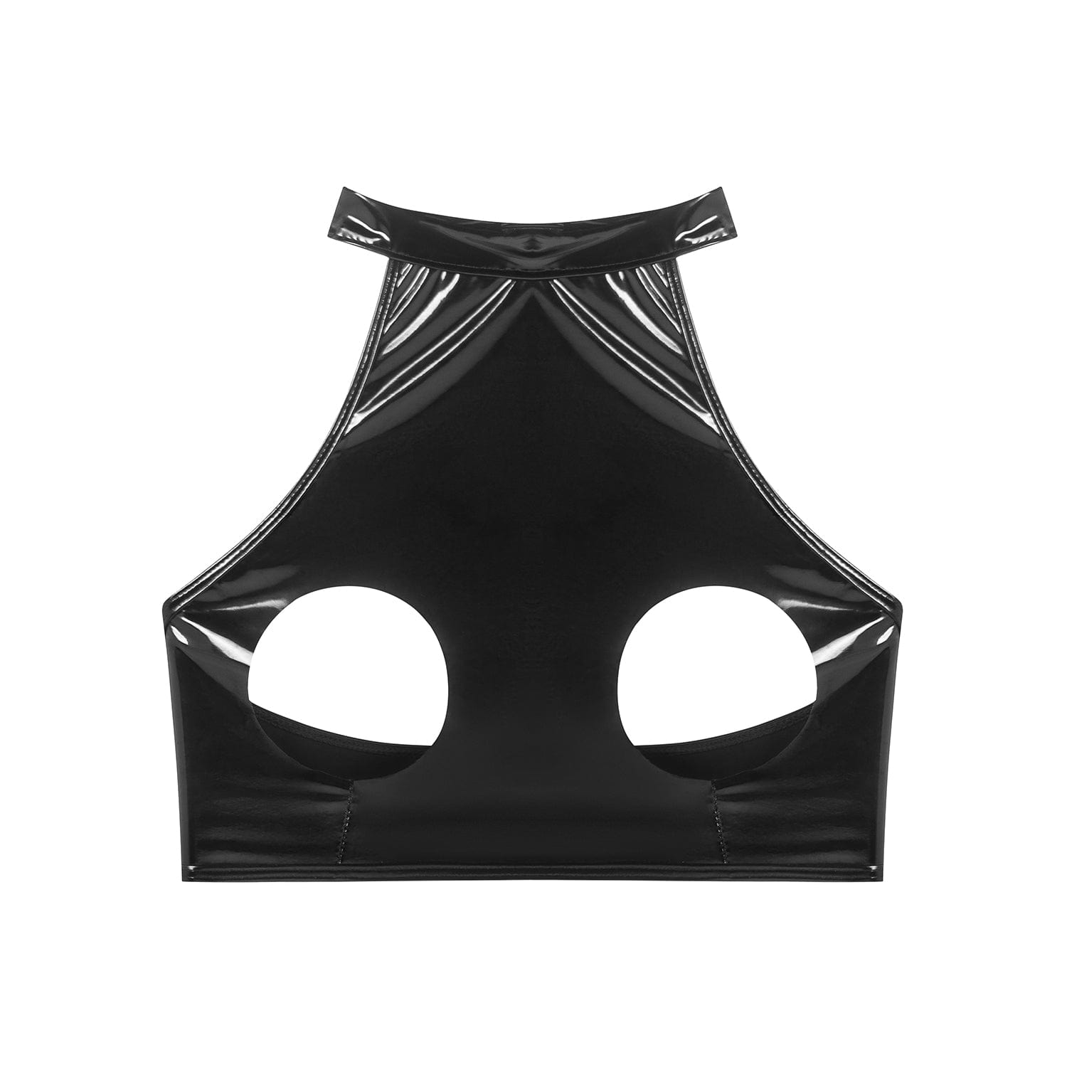 Women Shiny Leather Halter Neck Bra Hot Breast Exposed Lingerie Xokesy-108