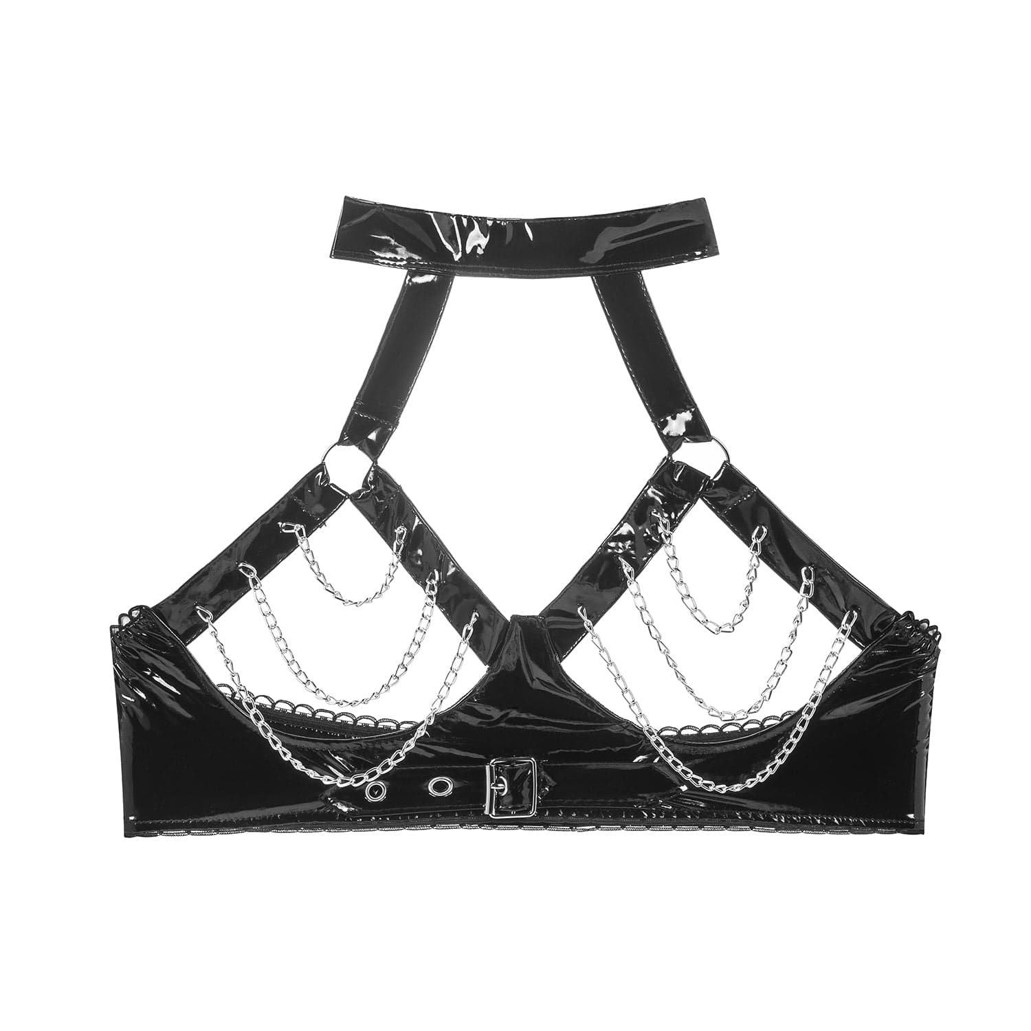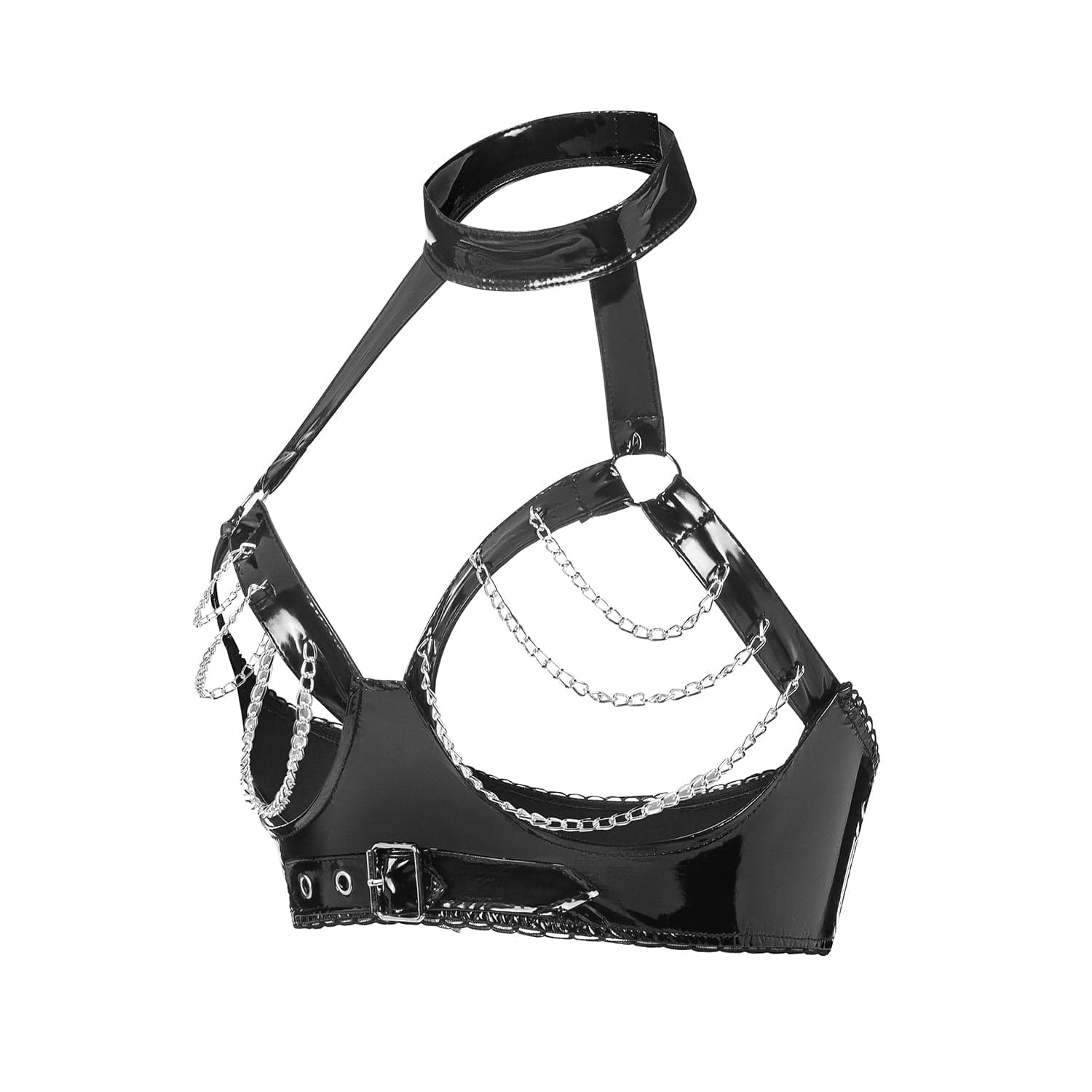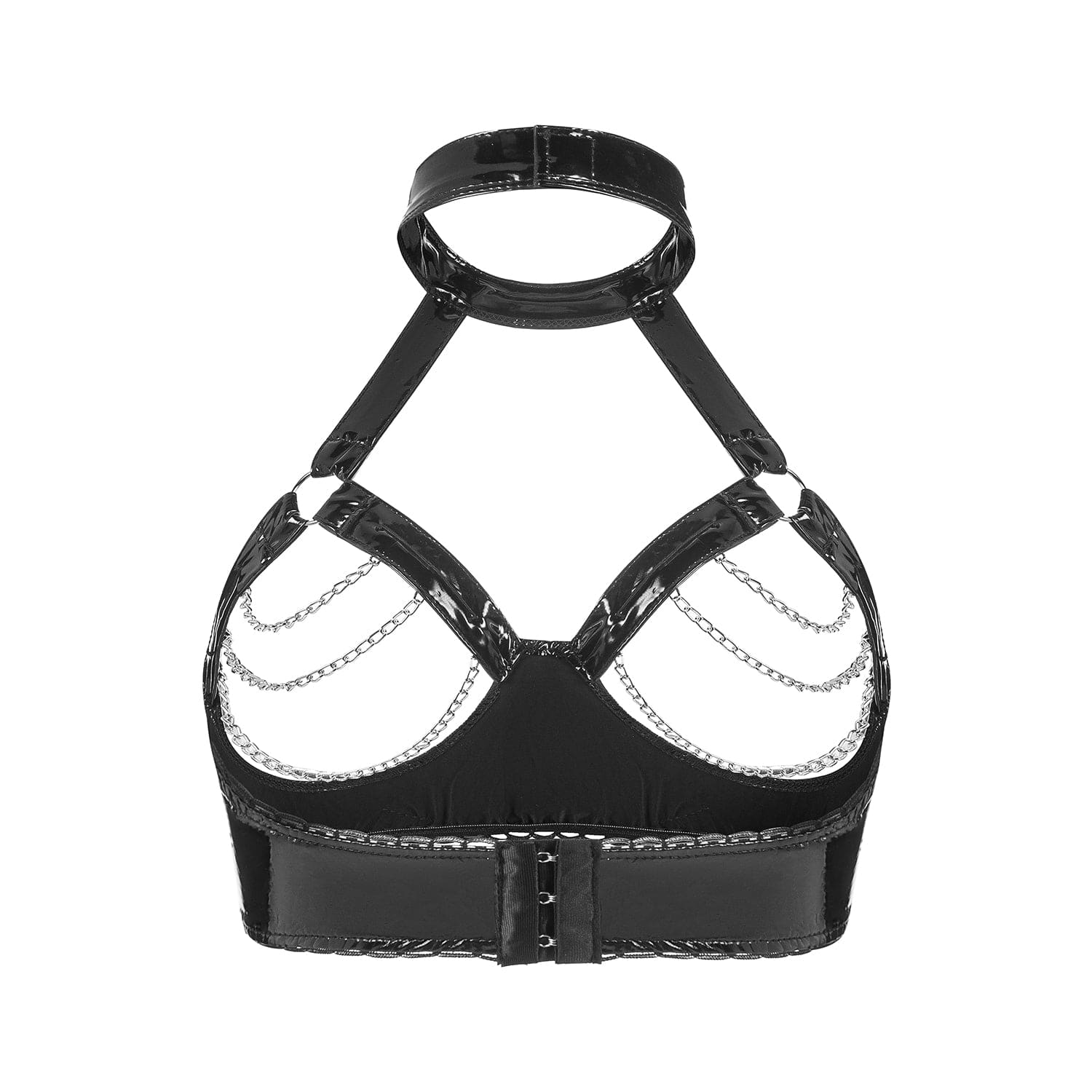 3. The shiny leather bralette is very sexy, erotic halter neck with chain, so it can add a lot of sexual love between couples. best for sleepwear,night club,romantic gift,honeymoon,wedding night,lingerie party,etc.